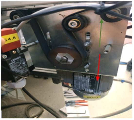 The power consumed by the motor driver had a direct relationship with the tension in the conveyor belt and the load on the conveyor, i.e., the number of pallets occupying the conveyor at a time. As mentioned in Section 3, the conveyor paths of the FASTory line were divided into zones, and for the same belt tension, the presence of a pallet in different zones had different effects on the power consumption of the driver motor. The power consumption data were collected for all zones according to the zone combinations shown in Table 2. The belt tension of the main conveyor could be varied by moving the head pulley upward or downward, as shown in Figure 6. The green arrow points towards a decrease in belt tension, while the red arrow points towards an increase in belt tension. The belt tension was varied from 0% to 100% by adjusting the head pulley position between a 0 and 2.7 cm adjustable distance. This became necessary as it was important to determine the optimal belt tension range of the head pulley. The belt tension was increased gradually to determine the lowest belt tension required to set the conveyor belt in motion. The belt tension was first increased from 0% to 60% at 15% intervals until the belt started touching the head pulley of the motor driver. Following this, the belt tension was increased by 10%. At 70% belt tension, the conveyor belt started moving without any load, but as soon as a pallet was placed on the conveyor, a jerky motion was observed. The belt tension was then increased by 5% to check how it affected the power consumption, the pallet transportation and how it differed from the previously collected data. Following this, the belt tension was increased at 10% intervals until reaching 95% belt tension. The head pulley was then moved all the way down to the maximum belt tension of 100%, thereby corresponding to 11 different positions of the head pulley. The data collection process lasted for one week. Table 3 lists the head pulley positions and corresponding percentages of belt tension.