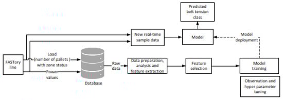 In Figure 7, the main steps for the development of the data-driven prognostic model for predicting the belt tension class is illustrated. The data were collected from the FASTory line during the static case and stored in a database for processing, analysis and feature extraction at a later stage. During the collection of data, the load on the conveyor belt and belt tension was varied according to Table 2 and Table 3 to monitor the effect of the active zone (i.e., the zone on which the pallet resided) and investigate the lower threshold value (smallest belt tension required to set the belt in motion) for belt tension, respectively. After storing the raw data in the database, the next step was to retrieve, process and prepare the data for analysis and feature extraction. Following that, the features were modified according to the ANN model requirements. Afterwards, the data were exposed to the ANN model for training and hyperparameter tunning. During this phase, activation functions for layers, the number of hidden layers and nodes in layers were changed until a good value was obtained for both loss and accuracy. This was important for the training and validation phases. The final version of the ANN model contained one input layer and two inputs (power and load values), and a “relu” activation function was used. There was one output layer with a “softmax” activation function and there were two hidden layers with a “relu” activation, with each hidden layer having 10 nodes. This model used “L2 regularisation” to avoid overfitting, and for optimization, the “adam” optimizer was used. The ANN model was trained on 80% of data, 10% of data was used for validation and the remaining 10% was used for model testing. After finishing all the steps, the model was deployed for consuming real-time data coming from the FASTory line and predicting the belt tension class.