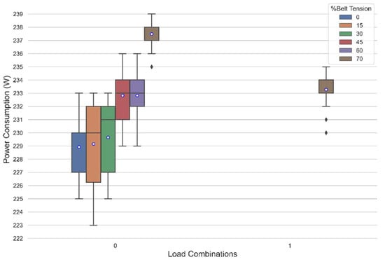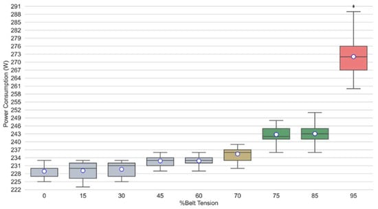 Similarly, Figure 12 shows comparison boxplots for 0% to 85% belt tensions. From the analysis presented in the previous section, for the 0% to 70% belt tensions, the conveyor belt parameters remained the same irrespective of the fact that for the 70% belt tension there was motion in the conveyor belt under the no load condition, but as soon as there was a pallet at Z1, the belt slip at the head pulley increased and the power consumption dropped to 232.2 W (data mean), hence, leaving no separation boundary between the 60% and 70% belt tensions. Therefore, all belt tension values which were less than or equal to 70% were treated as not useful belt tension values.