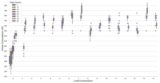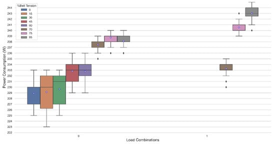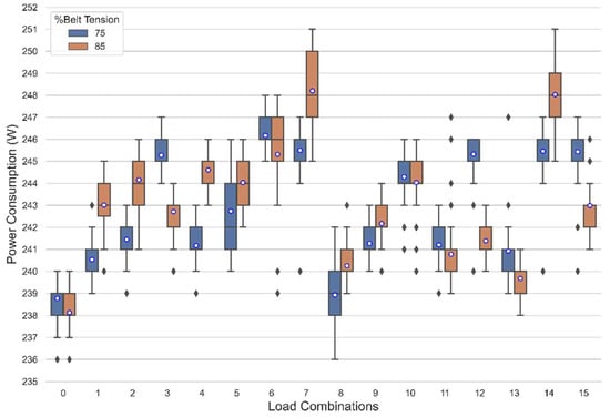 The results obtained for 75% belt tension with the load combinations 6, 7 and 14 (i.e., Z2 and Z3 were active for each combination) and 15 (all zones were active) were prominent. For these combinations, a reduction in the belt traction force and an increase in belt slippage was observed. For 85% belt tension, either no reduction in the belt traction force or an increase in belt slippage was observed. For these belt tensions, the experiment was conducted for all load configurations, i.e., the experiment was repeated for every load combination listed in Table 2. Figure 9 shows the boxplot for 75% and 85% belt tensions, depicting the effect of the pallet positions and belt tensions on the conveyor belt motor driver’s power consumption.