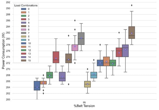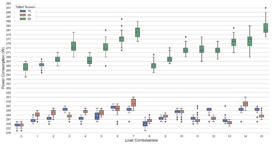 For 95% belt tension, a minimum power consumption of 259.5 W was recorded for load combination 0 (no load) as compared to previous belt tensions (0% to 85%), which was greater than the maximum power consumption of 251 W recorded at 85% belt tension for load combinations 3, 7, 14 and 15. Figure 11 shows the comparison boxplots for 75% to 95% belt tensions. For 75% to 95% belt tensions, the conveyor belt motor driver power consumption varied between 235 W and 289 W, and for the 75% and 85% belt tensions, the power consumption varied from 235 W to 251 W. As mentioned earlier, 95% was the maximum belt tension that could be achieved in the conveyor belt, and any operation with this belt tension is harmful for both the motor and the belt and must be avoided.