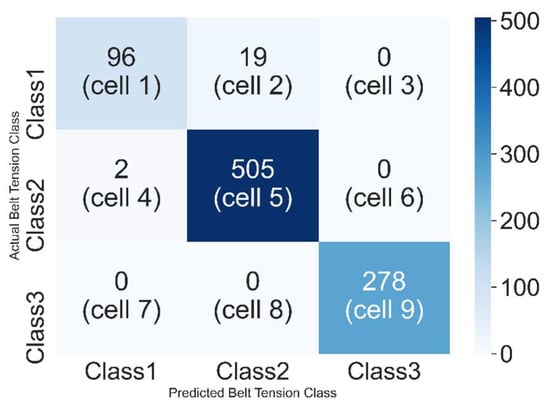 After testing, the model was used for the prediction of real-time data coming from the FASTory line, and prediction results went according to expectations. During the real-time prediction, both belt tensions and loads were varied by the line operator according to Table 2 and Table 3, respectively. Similar to the test data, the same misprediction was observed for the real-time data. To assess the performance of the developed model, a confusion matrix providing a comparison between the actual and predicted belt tension class was used. The confusion matrix was N × N matrix, where N is the number of outputs of classes. In our case, there were three classes and, therefore, a 3 × 3 matrix. Figure 15 shows the confusion matrix of the developed prognostic model. The true positive, false positive, true negative and false negative values could be calculated from the model’s confusion matrix.