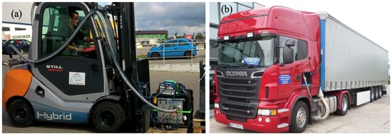 Contrary to the carriage of passengers, the transport of goods is characterized by a greater level of complexity. It is because, aside from the transporting operation, the handling operations play an important part in the process [13]. Given the above, when determining the emission level and energy consumption in the carriage of goods, it is important to complete the investigations on each stage of the transport process (handling and transport). In the handling process, a variety of mechanical handling equipment (MHE) is used, fitted with different types of powertrains. One of the fundamental equipment is forklifts falling into the category of non-road mobile machinery, whose homologation process is based on tests performed under laboratory conditions. The powertrains of these machines are tested using two types of tests: Non-Road Transient Cycle (NRST) and Non-Road Stationary Cycle (NRTC). Homologation tests, performed on engine dynamometers, are also carried out on heavy-duty vehicles used in the process of the transport of goods. Heavy-duty vehicles (HDV) are tested according to the dynamic (World Harmonized Transient Cycle-WHTC) and stationary (World Harmonized Stationary Cycle-WHSC) cycles [14]. What is crucial, however, is that these tests are performed under precisely determined conditions and do not fully reflect the actual conditions of operation of these units. A multitude of research and papers [15,16,17,18] confirm that the emission of individual exhaust components during tests performed under actual operating conditions differs from those obtained under homologation conditions, sometimes even exceeding the legally imposed emission limits. The above publications show the real problem related to the testing of combustion engines whose emissions are sensitive to a variety of external factors such as the operator’s behavior, weather conditions or location of the operations. This problem pertains to both light-duty vehicles tested on chassis dynamometers and heavy-duty ones tested on engine dynamometers [19]. The solution to the above are tests that are based on a Portable Emission Measurement System (PEMS). Portable equipment allows obtaining true data and determining reliable emission levels of the tested units under actual conditions of their operation. This is particularly the case for non-road machinery whose operating regimes vary depending on their applications [8,20].
