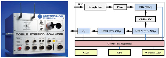 For the investigations, the authors used SEMTECH DS, a portable emission measurement system (Figure 2). The equipment provided by an American supplier enables an analysis of the composition of the exhaust gas under the conditions of actual operation. The system can measure the concentration of CO, CO2, NOx, HC and O2. Utilizing the on-board diagnostic and GPS systems, the equipment also records the engine parameters (engine speed, load). The method and accuracy of the measurement of each of the exhaust components have been presented in Table 2. A gas sample taken directly from the exhaust system travels to the device through a flow meter and a heated line where, in the analyzers, the concentration of individual exhaust components is measured. The idea behind the heating of the line to the temperature of 191 °C is to counteract condensation of hydrocarbons. The gas filtered from particulate matter initially gets to the FID (Flame Ionization Detector) analyzer where the HC measurement is carried out. Then, upon chilling of the gas to the temperature of 4 °C, the concentration of NOx (collectively NO and NO2) is measured in the NDUV (Non-Dispersive Ultraviolet) analyzer. The last of the analyzers-NDIR (Non-Dispersive Infrared) is responsible for the measurement of CO and CO2. The content of O2 in the analyzed gas is measured using an electrochemical sensor.