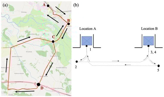 The tractor-trailer was tested under actual traffic conditions. The procedure covered a trip on the urban, local, and national roads whose total length was 27 km. The key roles were played by the test route and the location of the test. The authors paid particular attention to truly reproduce the transport system of goods with heavy-duty vehicles. For this reason, the test started and ended in the city’s industrial zone hosting a multitude of production facilities. The test of the collective duration of 30 min. included a drive through the city (A-B) and a trip to the motorway junction (B-C-D). The last stage was the return to the initial location. Figure 3 presents the test route of the tractor-trailer and forklift research cycle.