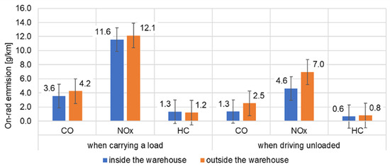 The authors of this paper have analyzed the obtained results separately for the handling and the transport processes to estimate the emission level and energy consumption of the entire transport cycle. For the sake of an in-depth analysis of the handling process, the study included the lifting and lowering of the palette, a run with the load and without it. The results of the comparison of the road emission for the measurement performed inside the warehouse and on the lot considering individual stages of the forklift test have been presented in Figure 4. From the graph, it directly results that during the operation of the forklift on the lot, the emission of carbon monoxide increased by 19% for the forklift carrying a load and 87% for the empty run. The same trend was observed for nitrogen oxides. For the latter exhaust component, the authors observed a significant (approx. 50%) increase in its emission during an empty run on the lot. It results from a sudden increase in the vehicle speed and dynamics compared to a run with the load. Hydrocarbons had a different trend. The carriage of cargo inside the warehouse was characterized by a small increase compared to the empty run.