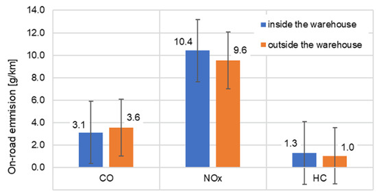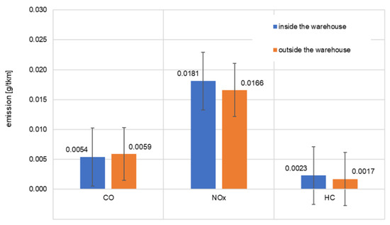 The overall analysis of the handling processes for 1 ton of freight has been presented in Figure 5. The investigations have clearly indicated an increase in the emissions of carbon monoxide by approx. 13% during the outdoor test. The situation for the nitrogen oxides was different. An increased emission thereof was observed during the indoor operation. These trends are directly related to the quality of the pavement, on which the vehicle operated. The good quality of the infrastructure inside the warehouse allowed a more dynamic operation. These conditions resulted in the increase of the emission of NOx by 9% compared to the same test run performed outdoors where the lot was paved with concrete sett. The uneven surface forced the operator to adapt its driving style to the conditions to prevent damage to the handled goods. The authors also determined the average emission in time of individual exhaust components: 6.097 × 103 g/h, 8.88 g/h, 29.57 g/h and 3.69 g/h for CO2, CO, NOx and THC, respectively. The obtained results are similar and remain within the range of average emissions obtained by Pang et al. [39] in their analysis. In the said publication, the testing of 12 diesel-fueled forklifts has shown that depending on the work cycle, the time emission indexes may reach 1.9–12.3 g/h, 11.2–78.0 g/h, 12.2–72.3 g/h, 12.2–72.3 g/h for CO2, CO, NOx and THC respectively.