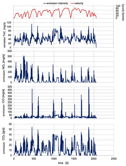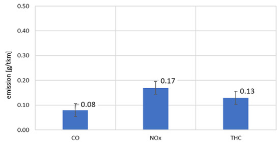 The exhaust emissions in the carriage of goods are tightly related to the weight of the transported cargo. Therefore, the authors decided to refer to the emissions of individual exhaust components in the performed transport work of the investigated vehicles. For the transport of 24 tons of cargo with a tractor-trailer (Figure 8), the following emission indexes were obtained: CO–0.08 g/tkm, NOx–0.17 g/tkm and THC–0.13 g/tkm. Out of all the analyzed exhaust components, nitrogen oxides were characterized by the greatest index. The emission index of CO2 in the tests was 42.25 g/tkm. Eickman [45] tells that the emission of carbon dioxide per ton-kilometer on the route Lehrte–Hameln (Germany) was 80 g/tkm for a tractor-trailer and 49 g/tkm for a train with 20 railroad cars. It is noteworthy that these values were estimated based on ecological databases of local and long-distance traffic.