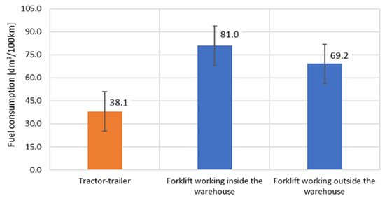 The authors have also calculated the fuel mileage (Figure 7). In the discussed investigations, the forklift operating outdoor on the lot was characterized by a lower fuel demand. During the loading of 1 ton of cargo under different conditions, an approx. 17% increase in the energy demand was observed that was eventually calculated to be approx. 81 dm3/km. In relation to HDV vehicles, the energy consumption mainly depends on the covered distance, vehicle speed, and weight of the transported cargo. From the performed measurements it results that the fuel demand of the tractor-trailer reached a level slightly higher than 38 dm3/100 km. On the other hand, tests performed on a vehicle of the same make but fitted with a Euro III compliant engine have shown a fuel mileage on the level of approx. 41 dm3/100 km [44]. In the test presented in Ziółkowski et al. [31], the fuel mileage of the investigated vehicle (the same vehicle was used for the investigations of the transport cycle described in this paper) was 30.9 dm3/100 km.
