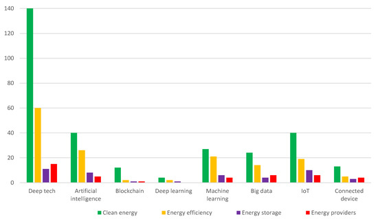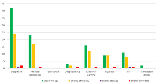 - Technology: Deep tech is of primary importance in solar energy, being slightly less significant in IoT (respectively 57.9% and 52.6% of indications by startups in the storage sub-industry, while 65.2% and 26.1% in the providers sub-industry). As it can be construed from the figure, the other technologies are applied (regardless of the sub-industry) rather sporadically (Figure 7).