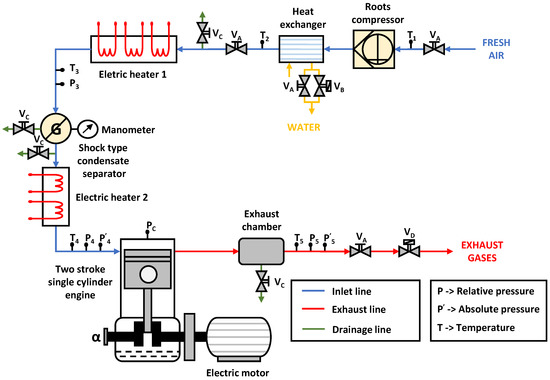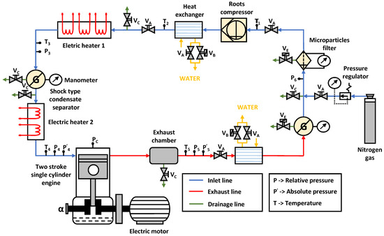 The main part of the experimental facility is an adapted version of a Jenbach JW-50 two-stroke, single-cylinder diesel engine with 3 L displacement. The main constructive characteristics of this engine are the following: cylinder diameter of 150 mm; total stroke of 170 mm; effective stroke of 108 mm, total original compression ratio of 26.3/1, original compression ratio of 17.1/1, and maximum rotational speed of 700 min. The gas motion is produced through the inlet and exhaust ports, following a Curtis-type scavenging process. After the engine head modification, the effective compression ratio is around 9.5/1. In addition, the engine torque and power depend on the boost pressure and quantity of fuel injected, taking into account that the maximum in-cylinder pressure must be lower than 100 bar (10 MPa) to avoid the breakage of the quartz windows.