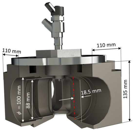 Figure 3 shows the cylinder head used. Four of the accesses are on the sides, and the other is on the top. The in-cylinder pressure sensor is mounted in one of the lateral accesses, while quartz windows (L88 × W37 × E28, R18 mm) are installed in the other three accesses. The quartz windows support a maximum pressure of 120 bar (12 MPa) and a maximum temperature of 1350 K. The upper access (D24 × L10.5 mm) is used to allocate the fuel injector.
