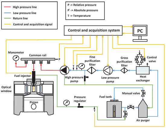 The injection system allows the injection event to be carried out inside the combustion chamber. Figure 4 shows a scheme of the injection system. The system is equipped with a Bosch common-rail system with a capacity of 20 cm that allows it to reach injection pressures up to 1300 bar (13 MPa). The fuel injector is configured with a single-hole axial nozzle with a K factor of 1.5 and a hole diameter of 0.140 mm.