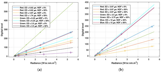 To transform gray levels into radiance values, calibration curves are obtained using an OSRAM-calibrated tungsten lamp, model WI 17/G; this allows us to obtain the relationship between the spectral radiance values for the two working wavelengths and the digital levels captured by the acquisition system. The lamp is located at the same distance from the cameras as from the flame in the combustion chamber [56]. The optical assembly simultaneously registers two images of the same combustion event. Using interference filters, it is ensured that the images taken by the cameras are formed only by radiation corresponding to the desired wavelength [56]. The calibration curves obtained for the different channel settings used in this study are summarized in Figure 6. The slope of each curve represents the different sensitivity obtained for each case. The plot on the left corresponds to the dynamic range comparison, while the one on the right represents the interference filter evaluation. For all the cases, a line is fitted to the calibration points (included in the figure). A good agreement is obtained in all cases, which also confirms the linear behavior of the CMOS sensors. Focusing on the plot on the left, for all cases, the use of neutral density filters to reduce the dynamic range provides calibration curves with a lower slope. This means that the detection system is less sensitive to radiation variations than with the high-dynamic-range configuration. When analyzing the interference filter comparison, the trend is not so clear because the blue filter allows the use of a more sensitive acquisition configuration for this channel, but the red one does not. The digital levels of the flame images are then transformed into radiation thanks to the calibration curves obtained in the calibration process.