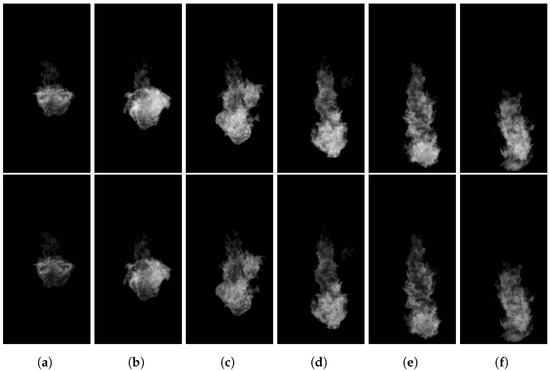 Images corresponding to a test performed with two-color pyrometry. Images were captured in high soot operating conditions and high dynamic range. The images above correspond to the red filter, while those below correspond to the green filter. (a) 1500 s. (b) 1850 s. (c) 2200 s. (d) 2550 s. (e) 2900 s. (f) 3250 s.
