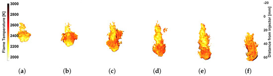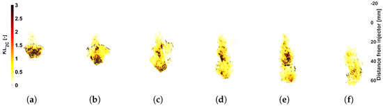 The high-soot operating point is reached by increasing the cylinder temperature and reducing the injection pressure. This produces a flame with more soot (more KL) and higher temperature. In the results, it can be seen that all the configurations evaluated are capable of characterizing this increase compared to the low-soot case (Figure 11 and Figure 13). However, for the combination of red–green filters and the configuration used in the study of interferential filters for low-soot conditions, the KL difference is not so clear. In this case, the exposure times were lower than those used in the dynamic range study for that pair of filters, which probably caused the green-filter camera to work closer to the sensitivity threshold. This resulted in a higher probability of error at the tip of the flame, as can be seen by comparing Figure 12d and Figure 14d. This represents a greater uncertainty of the measurement that, in this case, affects the precision of the results, as can be seen in Figure 13b for the case of KL with the red–green filters. This greater uncertainty in the measurement is also reflected in the temperature, which shows a large oscillation and a lower temperature value in the frontal zone of the flame.
