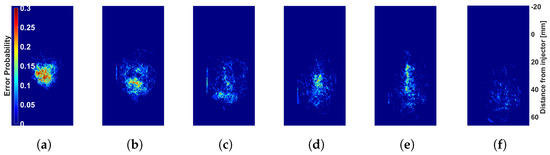 Error zone probability maps for non-physical solutions after processing. (a) 1500 s. (b) 1850 s. (c) 2200 s. (d) 2550 s. (e) 2900 s. (f) 3250 s.