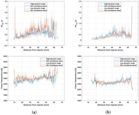 Comparison of high and low dynamic range for KL and temperature. t = 2900 s. (a) High soot. (b) Low soot.