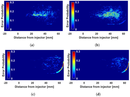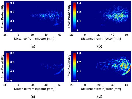 Error zone probability maps for non-physical solutions. t = 2900 s. (a) Red–blue filters and high soot; (b) red–green filters and high soot; (c) red–blue filters and low soot; (d) red–green filters and low soot.