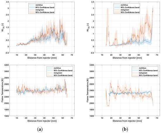 Figure 13 shows how the KL and temperature values varied along the flame axis for the two filter combinations and the high- and low-soot operating points. The 95% confidence interval is represented as colored areas around the average values. It is observed that the combination of red–blue filters yielded lower KL values for both operating points. On the other hand, it can be seen that the combination of red–blue filters yielded slightly higher temperature values at both operating points. In general, the differences were within the range of the confidence interval. However, for the low-soot case, large differences between 40 and 60 mm can be observed for both KL and T (even larger than the corresponding confidence interval). Figure 14 shows the error zone probability map for the non-physical solutions of the two filter combinations and the high- and low-soot operating points. It is observed that the combination of red–green filters generated more zone 2 errors in the area between 40 and 60 mm, where major differences were recorded. Therefore, it can be stated that the results shown in Figure 13 are more reliable for the red–blue combination than for the red–green.