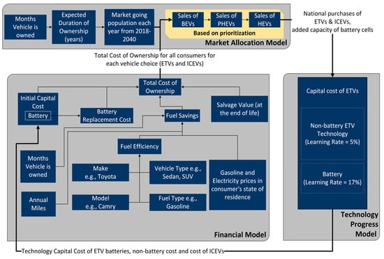 Method to model future prices and adoption of Battery Electric Vehicles (BEVs), Plug-in Hybrid Electric Vehicles (PHEVs), Hybrid Electric Vehicles (HEV), and Internal Combustion Engine Vehicles (ICEVs), in the U.S. from 2018 to 2040. The three sub-models are the Financial Model, the Market Allocation Model, and the Technology Progress Model, which are run in annual loops: The Financial Model (Section 2.2) calculates the Total Cost of Ownership of each vehicle type for each consumer. This information is sent to the Market Allocation Model (Section 2.3), which uses each consumer’s vehicle lifetime to determine who purchases a new vehicle that year, then determines which vehicle type (ICEV, BEV, BHEV, or HEV) they purchase, according to least cost. National purchases are accumulated for that year and used in the Technological Progress Model (Section 2.4) to determine cost reductions for the next year, using an experience curve. Multiple sources are used to develop this model. The geographical (state of residence i.e., fuel prices) and behavioral heterogeneities (annual miles, months vehicle is owned, vehicle make and model) come from the U.S. National Household Travel Survey []. The fuel economy [] and fuel prices [,,,] come from different sources. Similarly, the capital costs of technologies [,,,,,,,,,] and learning rates of battery cells [,,,,] and non-battery technologies [,,,,,] come from different sources.