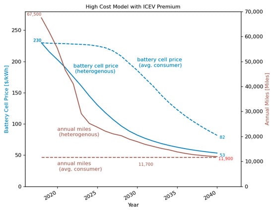 Figure 2 also shows the average annual mileage of the consumers that purchase an ETV. Moreover, it is evident that the average annual miles of the subpopulation that adopts an ETV is significantly higher (67,500 miles, i.e., 108,600 km for the year 2018) than an average consumer’s annual mileage (11,700 miles, i.e., 18,800 km). The average annual mileage of those choosing an ETV declines rapidly over time, showing that cost reductions for batteries and powertrain electronics rapidly broaden the pool of consumers that benefit from ETVs. As shown in the figure, when heterogeneity is included in the model the average annual miles of consumers moving to an ETV falls from 67,500 miles (108,600 km) to 11,900 miles (19,150 km), at which point ETVs are preferred by almost the entire population. The stark differences in results for heterogenous versus non-heterogenous modeling of consumers demonstrates the important interactive effects of technology progress and heterogeneity: Adoption is much faster and higher overall when both are considered together. A critical part of these results is also to understand that there is adoption of ETVs even in case of average consumers, this adoption is a result of the ICEV cost premium which represents conventional vehicles getting more expensive over time, and hence the financial outlook of ETVs improves compared to ICEVs, resulting in ETV adoption.