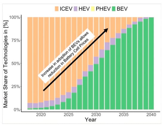We use the aggregate term Electric Technology Vehicles (ETVs) to refer to Hybrid Electric Vehicles (HEVs), Battery Electric Vehicles (BEVs), and Plug-in Hybrid Electric Vehicles (PHEVs). Fuel Cell Vehicles also use electric motors, with distinct technology and cost structures, e.g., Wróblewski et al., 2021 []. We exclude Fuel Cell Vehicles or alternative storage technologies in further discussion, assuming that lithium-ion battery-based and internal combustion engine-based vehicles will dominate the passenger vehicle market, at least until 2040.