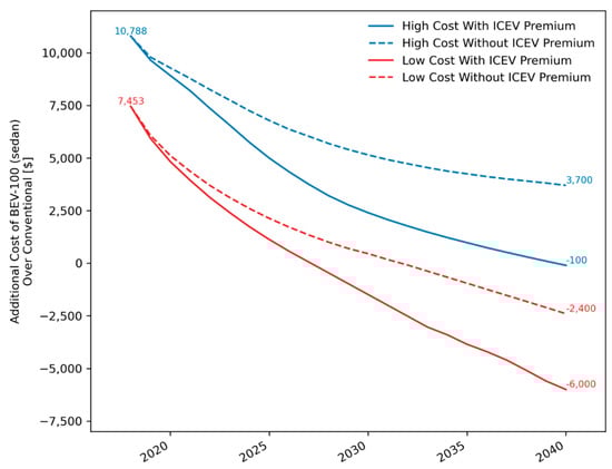 Due to broad disagreement between analyses and the lack of a single authoritative study, we used two different cost models, each representing an extreme of non-battery EV technology cost assumptions. The High Non-Battery Cost Model is based on the International Council on the Clean Transportation (ICCT) report [] as the primary source. The model has comparative cost models for BEVs and PHEVs based on the bottom-up cost approach and contains component-wise costs. Secondly, the Low Non-Battery Cost Model is based on Bloomberg New Energy Finance (BNEF) [] projections. The Low Non-Battery Cost Model does not provide a component-wise breakdown of the costs but is a frequently referenced model in the EV research community. These two models generally agree on the cost of batteries but differ with respect to other components’ costs and cost trajectory.