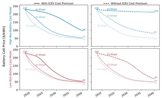 Battery Cell Price: There are many prior analyses, reporting a wide range of battery pack prices. Some of the literature estimates battery cell price and battery pack price separately. Along with lithium-ion (Li-ion) battery cells, there are components such as the battery management system (observes the output of each battery cell group), battery thermal management system (maintains operating temperature of the battery within the desired range), and related pack assembly (such as module frames, steel pack case, covers, inside wiring and electronics, etc.) which constitute a typical battery pack [,,]. We work up from battery cell price per kilowatt-hour (USD per kWh) for this study. We used USD 230 per kWh as the initial battery cell price in 2017. This price is in line with various estimates for the year 2018 from previous studies [,,] and reports such as Bloomberg New Energy Finance (BNEF) [] and the Joint Technical Support Document from the U.S. Environmental Protection Agency (US-EPA) []. However, it is also important to note some studies reported lower current battery cell prices (USD 145–159 per kWh [,,]), but we considered these as outliers.