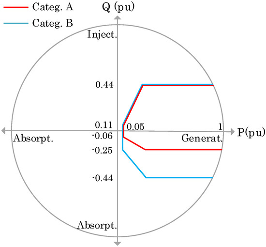 According to IEEE 1547-2018, for a continuous operation region, when the voltage at the point of common coupling (PCC) is between 0.88 and 1.1 times the nominal voltage, the distributed energy resource (DER) can be classified in two categories, related to reactive power capability and voltage regulation performance: Category A and B. The reactive power capability curves are presented in Figure 1.