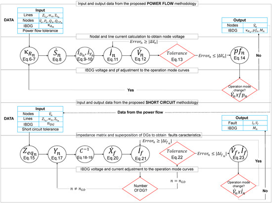 The flowchart of Figure 5 is divided into two steps, the first being for the calculation of the power flow and the second for the short circuit. Each step represents the method presented in Section 3 and Section 4. Each one has the three cycles: input and output of data, calculation of the power flow or the short circuit, and adjustment of the voltage and , or current, node values based on the operation curves of the IBDG.