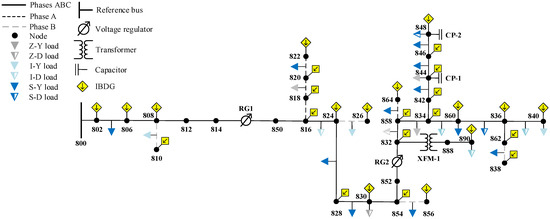 The proposed methods were implemented on the Matlab command line and had as database the IEEE Radial Distribution Test Feeders [17]. Among the available systems, the 34-Node Test Feeder was chosen for being a network with 8 spot and 19 distributed loads, with impedance, current, and constant apparent power, with delta and wye configuration types, in addition to associated capacitors in the nodes, transformers and, voltage regulators on the lines, as presented in Figure 6. To represent a dominated scenario, every node with a load has an IBDG associated, where the source can provide a percentage power, based on the load power.