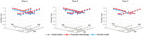 The average error for the 34-node system between the proposed method and the Simulink model, with a runtime of 85.88 s, considering the voltage from all phases, is 2.39%, considering maximum active power injection (100% ). The lowest error was found in phase B, being 2.18%, which has the greatest number of IBDG. In phases A and C, the errors were 2.46% and 2.70%, respectively. In Figure 8, the change in the voltage profile regarding the increase in penetration of active power by the IBDG is more significant as it moves away from the swing bus to node 810 in phase B and 806 for phase C.