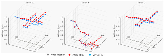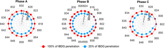In regard to the operation mode, shown in Figure 9, for 100% of injection of , all nodes with IBDG were in mode 5. By contrast, for a penetration of 25% of , with the exception of branches 802–810 for phase B and 802–808 for phase C, all nodes were in operation mode 4. These nodes are closest to the reference bus.