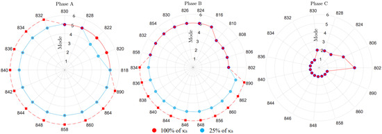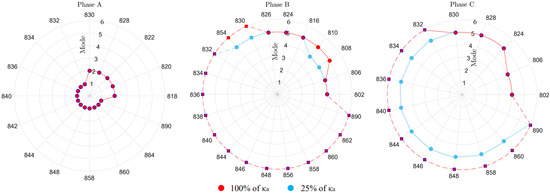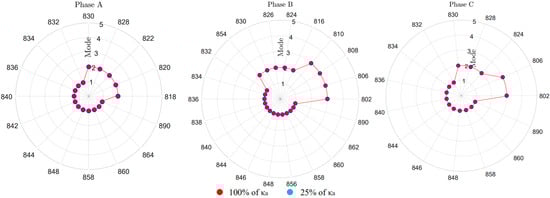 When applying a single-phase fault to phase A of node 848, a voltage dip occurs in the faulted phase. This variation, from the operation mode point of view, does not change with the injection of , as shown in Figure 10, and is concentrated in mode 1 as it approaches the fault, as demonstrated in Figure 11. In the neighboring phases, extrapolation of the mode occurs mostly in phase B, which holds the highest load, which only occurs in C for maximum .