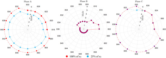 For the three-phase fault, there was no mode variation for 25% and 100% of . However, the effect of the loads being closer to the reference bus becomes more significant, and in this case, farther from the fault, which reduces the effect of voltage sag, as seen in Figure 16 and three operation modes in the branch 802–830, presented in Figure 17.