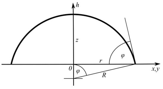 Figure 1 schematically shows the adopted coordinate system and geometric parameters used in Equation (2a–d). It should be emphasized that the wetted surface is circular due to the spherical shape of the droplet segment.