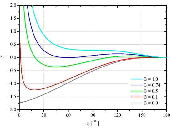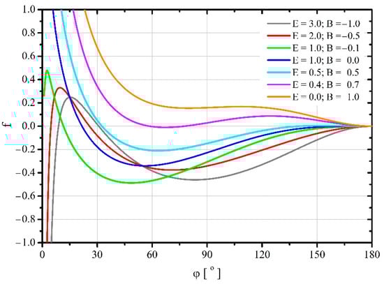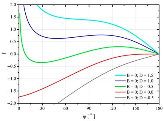 Due to the richness of the behavior of the considered system and the limited volume of the article, only three graphs shown in Figure 3, Figure 4 and Figure 5 were prepared for illustration. A single, stable minimum of free energy (Helmholtz) occurs whenever one of the following conditions is met [18]: or . In such cases, the droplets spread spontaneously on the substrate. However, due to the very significant values of parameter , the analysis of this issue would not assess the impact of parameter on the solutions of Young’s Equation (8), but would only contribute to the discussion of an unrelated case.