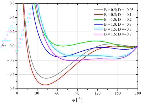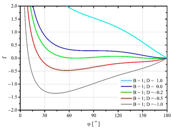 The results shown in [18] imply that for a surface adhesion force greater than or equal to zero ( or ), the equilibrium of forces in the analyzed system can only occur when . In addition, as shown in the previous paper [18], the solutions to the equilibrium equation of forces acting on the droplet for the value of the parameter divide the entire area of solutions to the equilibrium equation of forces into two parts. In the first region where the parameters can vary within the range and , a stable equilibrium of forces cannot exist for large values of the contact angle . On the other hand, in the second, for and , this stable equilibrium of forces cannot occur for small values of this angle. Since the relationship between the free energy and the forces acting on the droplet (3) and (5) is the same for both areas, the shapes of the free energy changes as a function of the contact angle should have a topologically similar course. To explore this, Figure 6 was created, on which several trajectories for each of the areas were plotted.
