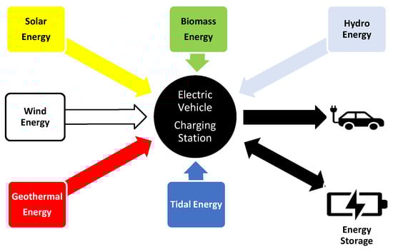 It may be good news for environmental consideration, but it also raises a serious question of how the growing electricity demand of these EVs will be satisfied by insufficient present generation systems. The immediate solution to this problem is to increase the burning of fossil fuels for electricity generation in traditional power plants, but this may result in increasing air pollution, which is the biggest cause of fatality []. Researchers are more focused on developing RE-based hybrid systems as future sources of electricity generation for charging EVs [,,,]. These EVs come with a portable charger and can be charged at home, but it takes too much time to charge a single vehicle. So, vehicle owners prefer to charge their vehicles in a fast-charging station, where it merely takes less than an hour to fully charge the vehicle.