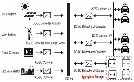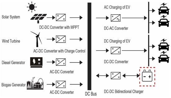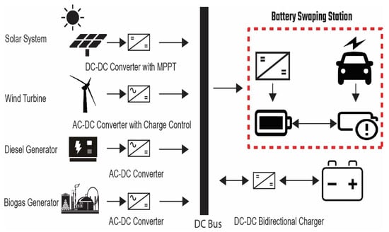 Over the past years, noticeable research has been conducted to improve the characteristics of energy storage systems []. Most of this research work is focused on the size and capacity optimization, modeling, and applications of the storage system in RE-based hybrid EV charging stations [,,,]. However, there are not many studies present in the literature on configurations of energy storage systems being employed in standalone RE-based hybrid EV charging stations.