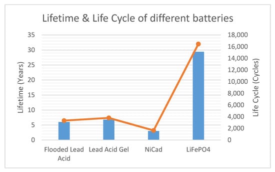 Herman Jacobus and Kanzumba Kusakana [] designed a wind-solar-based standalone hybrid electric tuk-tuk charging station with lead-acid storage and carried HOMER simulations to prove that a RE-based hybrid system with lead-acid battery storage is the most economical solution to charge more than one tuk-tuk in a single day. Karmaker et al. designed a low-cost PEV charging station for Bangladesh based on solar and biogas-based generation. A 100 Ah lead-acid battery bank containing 25 batteries was used for the storage of excess power in this system and state of charge (SOC) was also considered for the optimization purpose. It was concluded that with lead-acid storage, the proposed system has the lowest cost of energy (COE) and payback duration []. The main problem associated with lead-acid batteries is their low life. Battery life produces a deep impact on the overall cost of the power system []. Narayan et al. introduced a usage model of battery, based upon fading of dynamic capacity, and compared lifetimes of different batteries for the same load and same hybrid systems design. This comparison is shown in Figure 3 []. It is estimated that the LiFePO4 battery has more lifetimes compared to others. The life of battery storage depends upon its charge and discharge cycles and after a specified cycle, the battery reaches the end of its useful life []. After that, the waste of batteries produces environmental pollution. As compared to battery storage, hydrogen-based fuel cells have a permanent lifetime and less cost. This type of storage can also be used to directly fuel hydrogen vehicles.