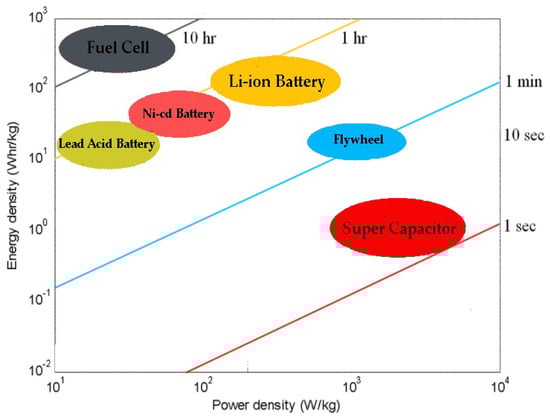 The amount of energy present in a unit volume of storage is termed energy density. A high energy density storage is recommended for future energy storage applications. Generally, high power density storage devices tend to have low energy density. An ideal storage system should have very high energy and power density so that it can provide quick power to the system and for a longer duration. Figure 6 represents a power density and energy density comparison of some famous energy storage systems.