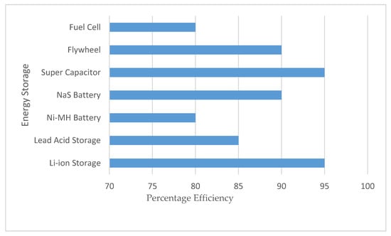 Efficiency is related to the losses occurring in energy storage systems. There is a term called round trip efficiency, which is a ratio between electric output and electric input for a single charge/discharge cycle. Future energy storage systems should have high efficiency and negligible energy losses. An energy system with 100% round trip efficiency is called an ideal system. Flywheel and supercapacitor storage systems have the highest efficiency (>90%), but these devices have the problem of high self-discharge []. The energy efficiency of some important storage technologies is given in Figure 7 [].