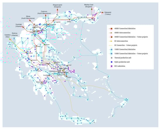 Evidently, Figure 1 illustrates the electricity network production, providing an insight to the conventional, RES substations, along with thermal and hydro production units that also play a significant role in the electricity production. Within the regime established by the National Plan, the efforts of the policy makers focus on the reduction of Greenhouse gas emissions being generated by conventional energy sources and their substitution with environmentally friendly energy sources such as Renewable Energy Sources (RES). The particular energy sources are considered more efficient than fossil fuels—a fact that is stressed in the National Plan strategy. This shift of the energy sector from fossil-based energy sources to renewable energy sources defines the concept of energy transition. This process may be achieved gradually, while the major elements of energy transition, which should be taken into consideration, involve the increasing penetration of renewable energy into the energy supply mix, and the onset of electrification and improvements in energy storage [5,6].