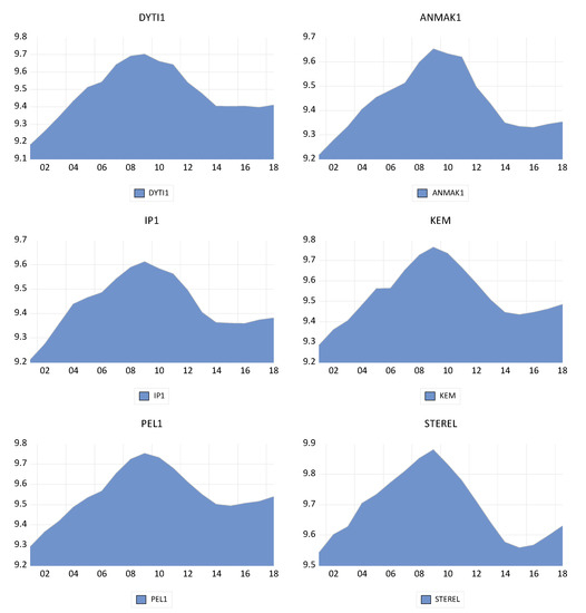 Despite the fact that our data do not include the completion of delignitization, it is significant to identify potential interdependencies and to unveil in non-lignite areas the use of alternative energy sources, and how these could be spread in Greek regions in order for the appropriate energy policy tools or even the statistical analysis focusing on panel unit root tests, in order to examine whether all the peripheries in Greece behave in the same way along with time and whether the absorption of ESPA projects is successful and efficient for the substitution of lignite with alternative energy sources. All the data employed were derived by National Statistical Service for the years 2000–2018 [49]. The next Figure 2 illustrates the evolution of the GDP per capita generated by the energy of all the peripheries for the time series studied.