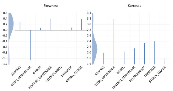 Figure 3 illustrates the skewness and kyrtosis of the variables studied in order to unveil the direction of outliers and the peak of the PDF of the time series.