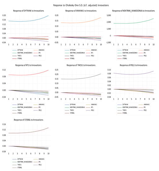More specifically, for the case of impulse and response analysis, an innovation in Anatoliki Macedonia and Thraki and a positive long term response for the next 10 periods is recorded for Sterea Ellada and Thessalia, while a slight negative one is recorded for all the other regions. The innovation recorded for Ditiki Macedonia seems to affect the GDP in a negative way in the long term for Peloponnisos, a result that is indicative of the competitiveness in the energy production among the two regions. In addition, an increase in the long term is illustrated in the last period for Anatoliki Macedonia and Thraki and Sterea Ellada. As far as Ipeiros is concerned, with the exception of Kentriki Macedonia, all the other regions seem to be affected in a negative way in the last two periods. An innovation in Kentriki Macedonia seems to be affected in a positive way in the last two periods while the response of sectoral GDP for Anatoliki Macedonia and Thraki is decreasing in this innovation in the long term. In the case of Peloponnese, an innovation entails an increase in the long term of its behavior while, with exception the case of Thessaly and for all the other regions in the period 9 and 10, a decrease in this sectoral GDP is evident, with Anatoliki Macedonia and Thraki being affected the most. As far as Sterea Ellada is concerned, an innovation leads to a decreasing value for Peloponnese, Ipeiros, and Kentriki Makedonia, while a positive response is predicted for all the other regions. Finally, an innovation in Thessaly is leading to a positive response in Sterea Ellada (a significant one) within the last two periods, while a negative response is predicted for all the other regions under review [61].