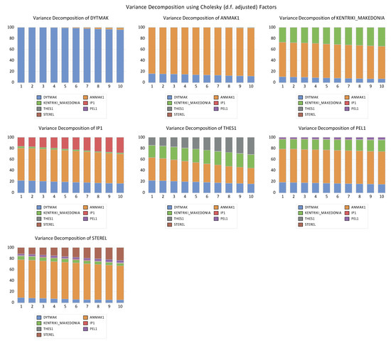 Furthermore, the forecast-variance decomposition provides a notification on the extent to which the forecast error variance of each of the variable can be explained by exogenous shocks to the other variables [60,61]. Based on our findings, the results to be presented and analyzed are provided in the next paragraphs.