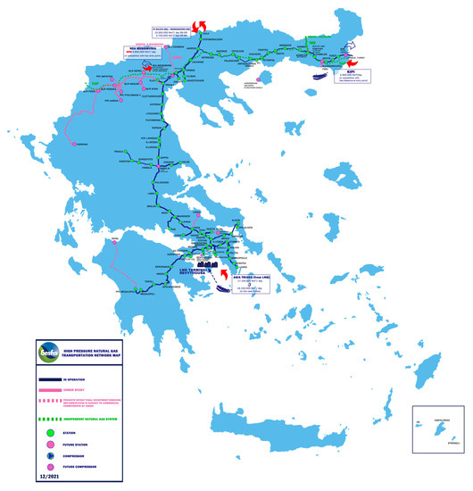 - Hellenic Gas Transmission System Operator S.A. DESFA. Available online: https://www.desfa.gr/en/national-natural-gas-system/transmission (accessed on 20 June 2021).